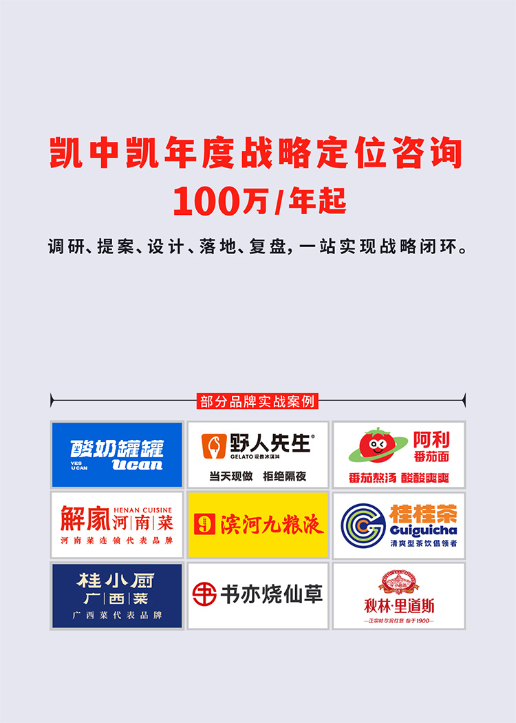 凱中凱核心創始團隊,曾通過40多期的戰略定位咨詢課程,為1000家以上的企業提供戰略輔導,其中連鎖餐飲和快消品企業居多,積累了大量案例經驗。十年來,很多連鎖餐飲和快消品企業選擇了凱中凱為其提供長期戰略咨詢服務,實現了戰略突破,獲得顯著成功。如:濱河九糧液、野人先生現做冰淇淋、酸奶罐罐、解家河南菜、桂小廚廣西菜、桂桂茶、大張烙饃村、秋林里道斯、竹妃紙巾等。
